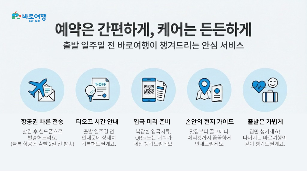 | 항공(유류+텍스) 숙박(2인1실) 식사(조/중/석식) 골프(그린피) 1억원 해외여행자보험 |
