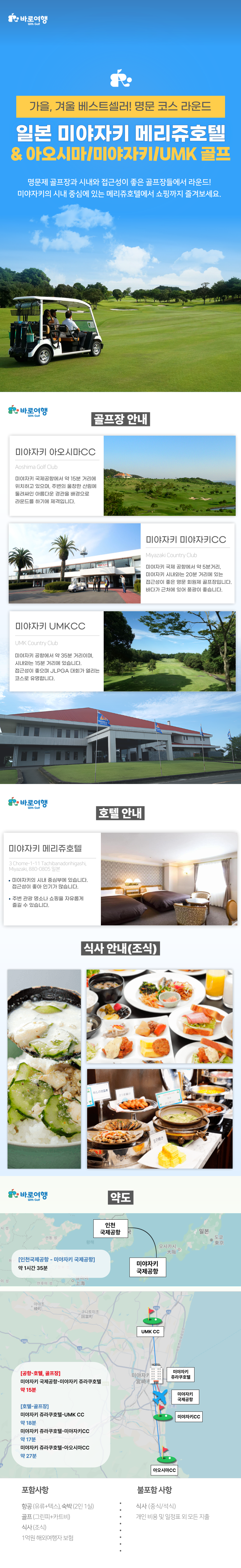 * 1일차 카트+셀프플레이/일몰까지/14시 30분 이후 * 상기 일정은 항공사 및 현지 사정으로 인하여 변동 될 수 있습니다. (천재지변으로 인한 일정변경은 손님부담) * 골프장 클로징 이외에는 골프비용 환불 불가입니다. (우천, 플레이지연등 환불 불가) * 싱글챠지(싱글룸이용) :1인 1박당 2,000엔UP 됩니다. * 송영비 추가 : 3명 출발시 전일정 1인 6,000엔UP / 2명 출발 불가 * 송영차량은 인원수에 따라 변동됩니다. 단독차량이 아니므로 다른분과 동승하실 수 있습니다. * 예약상황에 따라 골프장 순서 및 동급 골프장으로 변경 될 수 있습니다. 골프장 지정 불가 * 미야자키CC 2인 예약의 경우 다른팀과 조인될 수 있으며, 이경우도 1인 4,000엔의 2B 추가요금이 할증됩니다. * 연말연시 ( 12/28 ~ 1/5 )기간은 별도 문의 부탁 드립니다. |