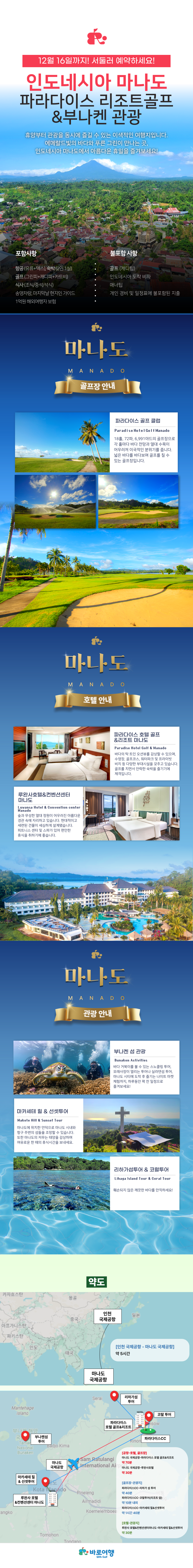 ※ 특전 : 1. 전반 9홀 라운드 후 Seasonal fruit juice 제공 - 1인1회 2. 출발전 사전예약 50%적용 - 리조트 마사지 90분/$25/1인, 120분/$35/1인 (마사지팁 $3 별도) 3. 마지막날 관광 + 한국어 가능가이드 포함(팁포함) 4. 9월 30일 이전 발권시까지 - 수화물 +5kg 추가 ※ 여행에 다른 즐거움 - 선택관광 1. 야간 낚시투어 $10/1인(20시부터~22시까지 운영) 2. 마나도 시내 마사지 90분/$40/1인(마사지팁 $3 별도) ※ 싱글룸 차지 : 파라디이스 호텔 리조트 1인/1박/$20, 루완사호텔 1인/1박/$30 ▶ 연휴기간 별도 문의 |
