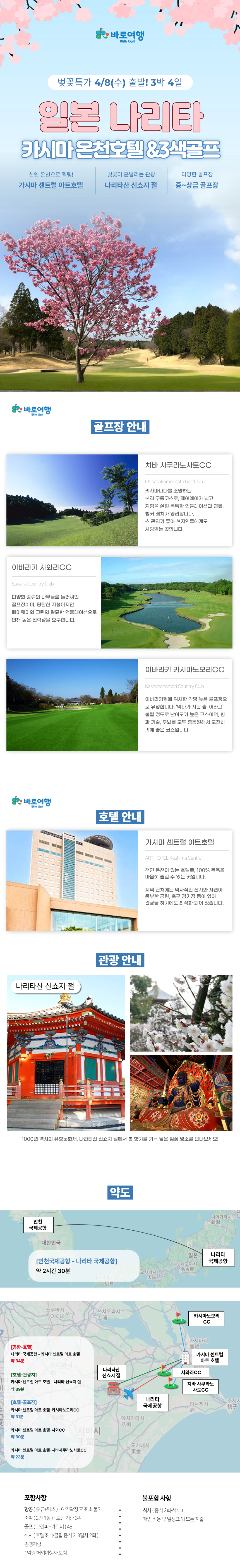 ✔️골프만 라운드하고 끝내기엔, 너무 아쉬운 날씨! 마지막 날 나리타산 신쇼지 절에서 벚꽃을 즐기는 일정까지~ ✔️천연 온천으로 라운드 후 피로까지 풀어보세요! ✔️치바 사쿠라노사토CC / 나리타 이바라키 사와라CC / 나리타 이바라키 카시마노모리CC 라운드! |